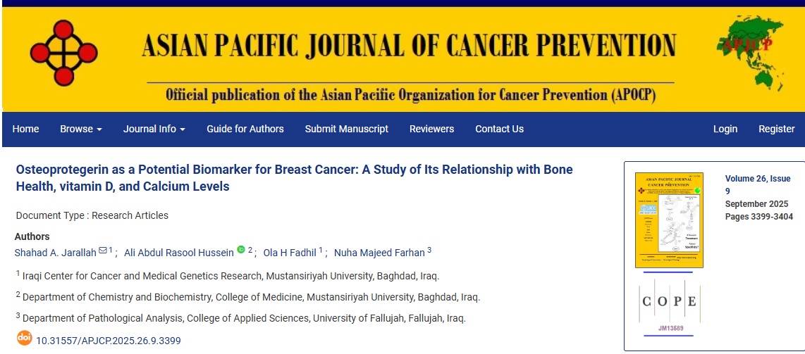 نشرت مجلة آسيا والمحيط الهادىء للوقاية من السرطان Asian Pacific Journal of Cancer Prevention بحثاً علمياً مشتركاً حول ( أوستيوبروتيجيرين كمؤشر حيوي محتمل لسرطان الثدي: دراسة علاقته بصحة العظام وفيتامين د ومستويات الكالسيوم Osteoprotegerin as a Potential Biomarker for Breast Cancer: A Study of Its Relationship with Bone Health, vitamin D, and Calcium Levels ) في المجلد 26، العدد 9 (2025) والذي أعده المدرس الدكتور علي عبد الرسول حسين ( التدريسي في فرع الكيمياء والكيمياء الحياتية في كلية الطب / الجامعة المستنصرية ) بالتعاون مع فريق بحثي من المركز العراقي لبحوث السرطان والوراثة الطبية التابع للجامعة المستنصرية وكلية العلوم التطبيقية / جامعة الفلوجة .