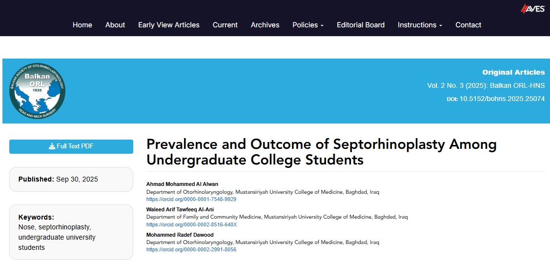 ضمن النشاطات العلمية والبحثية المشتركة بين أساتذة كلية الطب / الجامعة المستنصرية نشرت مجلة البلقان ORL-HNS Balkan بحثاً علمياً مشتركاً حول ( انتشار ونتائج جراحة تجميل الحاجز الأنفي بين طلاب الجامعات Prevalence and Outcome of Septorhinoplasty Among Undergraduate College Students ) في المجلد 2 العدد 3 (2025) والذي أعده كل من الأستاذ الدكتور وليد عارف توفيق ( رئيس فرع طب الأسرة والمجتمع ) والأستاذ الدكتور محمد رديف داود والمدرس الدكتور احمد محمد العلوان ( أعضاء الهيئة التدريسية في فرع الجراحة ) .