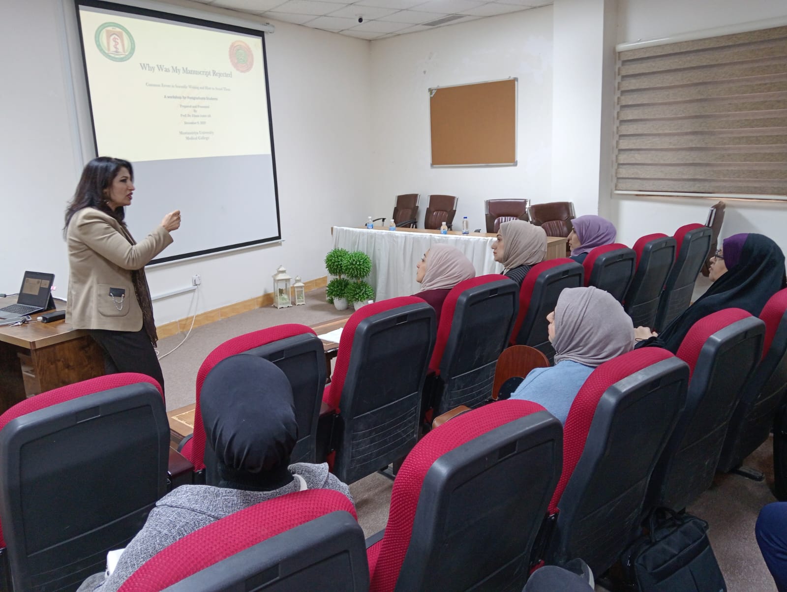 أقامت كلية الطب في الجامعة المستنصرية ورشة عمل عن ( لماذا يرفض المقيم مخطوطتك ؟ الأسباب الرئيسية للرفض ) ضمن برنامج تطوير مهارات البحث العلمي لطلبة الدراسات العليا والتي نظمتها شعبة التعليم المستمر وبالتعاون مع شعبة الدراسات العليا وفرع الكيمياء والكيمياء الحياتية ، حيث قدمتها الأستاذ الدكتورة ايهام عامر علي ( التدريسية في فرع الكيمياء والكيمياء الحياتية ) وبحضور نخبة من التدريسيين وعدد من طلبة الدراسات العليا من مختلف تشكيلات الجامعة وعلى قاعة مناقشات فرع الكيمياء والكيمياء الحياتية في الكلية بمجمع المستنصرية الطبي.