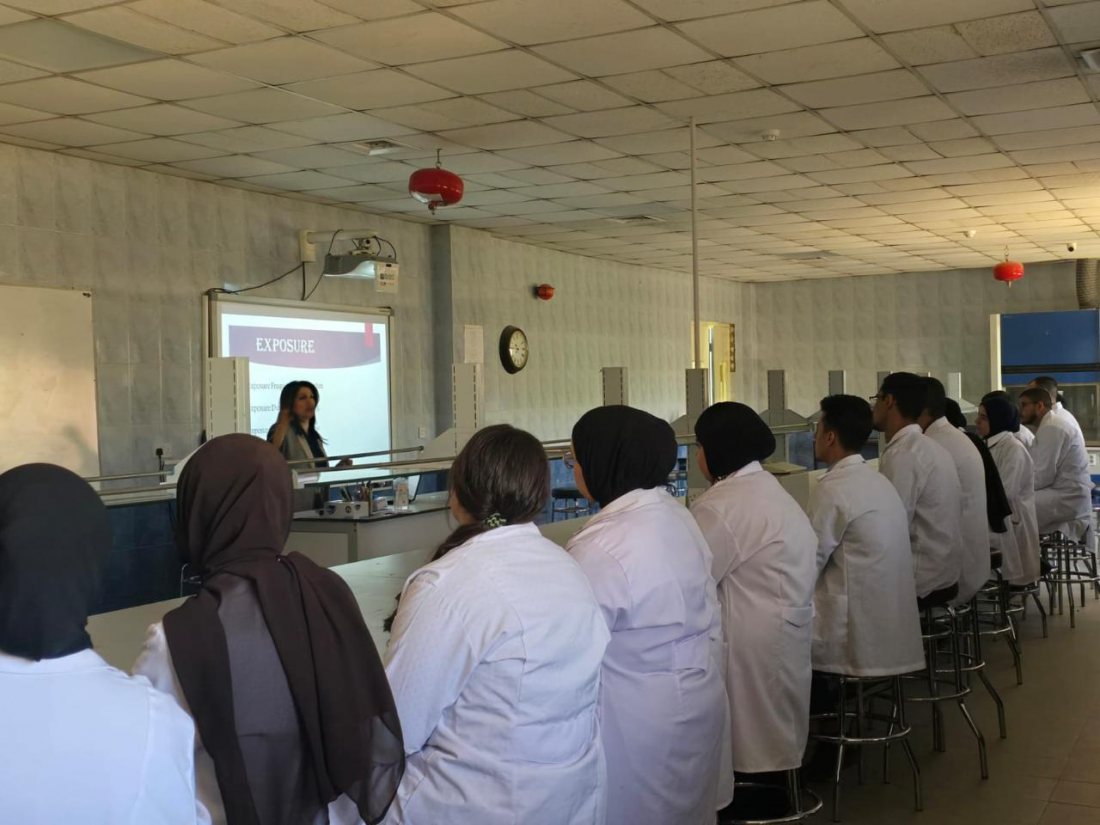 وتطرقت الى تعريف الطلبة ما هو الفرق بين السمية الحادة والسمية المزمنة للمواد التي يتعاملون معها في المختبرات ، وماهي المداخل الرئيسية في الجسم التي من خلالها يتم اختراق الجسم وكيفية أخذ الاحتياطات اللازمة لتجنب او لتقليل خطر الاصابة.