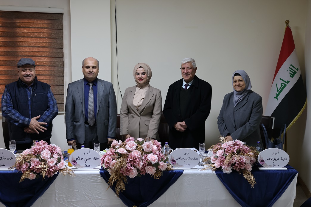 وكانت لجنة المناقشة برئاسة أ.د. يوسف عبد الرحيم وعضوية كل من أ.م.د. علاء علي صالح وأ.م.د. نادية عزيز ناصر واشراف أ.د. مازن غازي الربيعي ، وبحضور نخبة من الأساتذة والتدريسيين وطلبة الدراسات العليا .